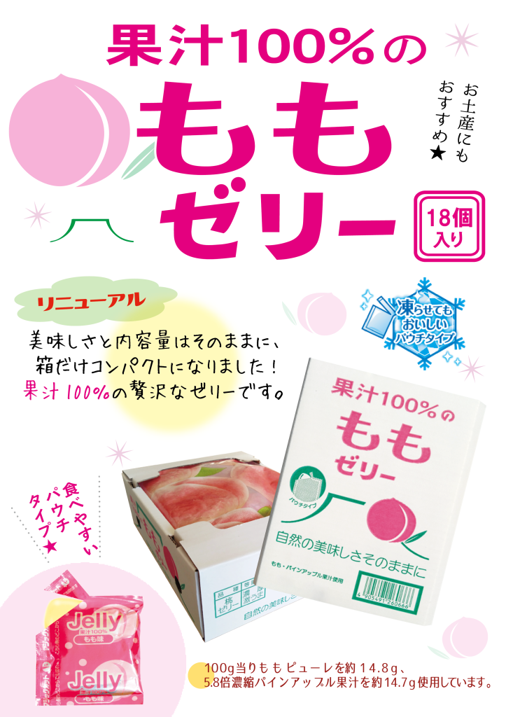 ASフーズの果汁100%ゼリーの中でも人気の「もも味」!爽やかなもも果汁の甘さ、美味しさが箱いっぱいに味わえます。
